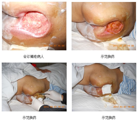 2012年3月7日,應(yīng)黃岡市中心醫(yī)院燒傷整形美容科主任馮先才的邀請,中國燒傷創(chuàng)瘍研究所研究員、中國燒傷創(chuàng)瘍科技中心主任金黨軍老師到該科室會診一例褥瘡患者,該患者年齡72歲,創(chuàng)面直徑13cm,且創(chuàng)面周圍皮下均有空腔。金老師到病床前查看患者創(chuàng)面,親自給患者換藥,同時跟醫(yī)生講解燒傷膏的使用方法,以及油紗的制作和加壓包扎的規(guī)范操作。