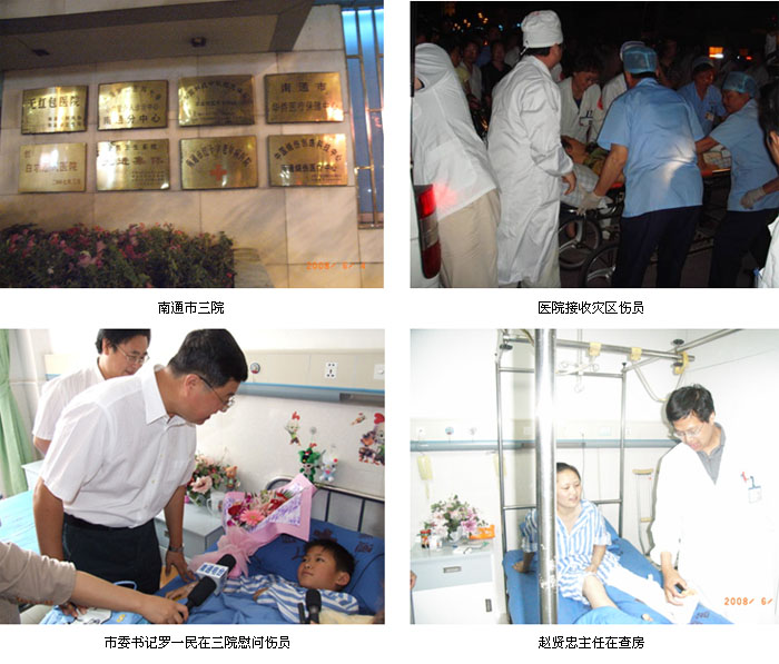 南通市第三人民醫(yī)院是一座集醫(yī)療、教學、科研為一體的三級甲等醫(yī)院,也是中國燒傷創(chuàng)瘍科技中心南通燒傷醫(yī)療中心,是全國燒傷創(chuàng)瘍醫(yī)療網的核心基地醫(yī)院。這次汶川地震傷員轉移治療中于2008年5月31日晚該院接收了10名四川傷員。災區(qū)傷員到達當晚,中國燒傷創(chuàng)瘍科技中心南通燒傷中心主任、中國抗震救災創(chuàng)瘍專家醫(yī)療隊江蘇組長趙賢忠主任受命對從災區(qū)轉來南通三院的所有傷員進行查房,并根據需要對所有相關傷員進行會診治療,保證災區(qū)傷員能得到先進的再生療法治療,最大限度地減輕傷情,減少繼發(fā)殘廢。6月1日南通市委書記羅一民來到市三院 “愛心病房” 慰問汶川災區(qū)傷員者,他走到綿竹傷員病床前,關切地詢問他的病情和護理情況,“你放心在這里養(yǎng)傷,南通人民就是你的親人?!崩钪蚊餮劾镩W著淚花: “醫(yī)護人員、志愿者都那么好,這里就像我的家!”