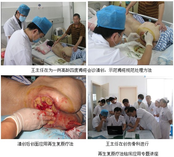 接下來(lái),王主任在該醫(yī)院燒傷外科為一例大面積燒傷患者會(huì)診后,又應(yīng)創(chuàng)傷骨科況主任的邀請(qǐng),為該科收治的一名高齡四度褥瘡患者進(jìn)行了會(huì)診,并親自為該例褥瘡會(huì)診清創(chuàng),示范規(guī)范的創(chuàng)面處理方法。示范手術(shù)結(jié)束后,王主任又應(yīng)邀為創(chuàng)傷骨科醫(yī)護(hù)進(jìn)行了“再生復(fù)原療法在難愈性創(chuàng)面治療新進(jìn)展”專(zhuān)題講座,并重點(diǎn)講解了再生復(fù)原療法在褥瘡、糖尿病足及骨科創(chuàng)瘍的創(chuàng)面規(guī)范化處理及全身綜合治療要點(diǎn),同時(shí)還講解了電擊傷及手指再生等相關(guān)臨床治療方法,講解完后,醫(yī)生均表示王主任這次的到來(lái)讓他們受益匪淺,他們從今天起一定會(huì)在臨床上使用原位再生療法造?;颊?。