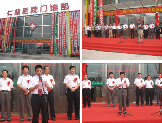 2010年8月8日,中國(guó)燒傷創(chuàng)瘍科技中心武安分中心、河北武安仁慈醫(yī)院舉行建院十五周年暨門(mén)診大樓落成、邯鄲市中心醫(yī)院技術(shù)協(xié)作醫(yī)院成立慶?;顒?dòng)。三喜臨門(mén),武安市仁慈醫(yī)院張燈結(jié)彩,從醫(yī)院領(lǐng)導(dǎo)到全體員工精神煥發(fā)、喜氣洋洋,武安市領(lǐng)導(dǎo)和人大、政協(xié)以及衛(wèi)生界各級(jí)領(lǐng)導(dǎo)出席盛會(huì),武安市各級(jí)醫(yī)院代表到會(huì)祝賀。
