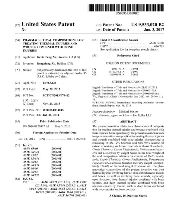 2017年1月3號,徐榮祥教授“治療熱力損傷、創(chuàng)傷合并骨損傷的藥物組合物”獲得美國專利授權(quán),專利號US 9,533,020 B2。