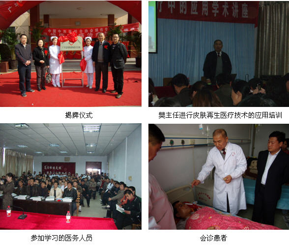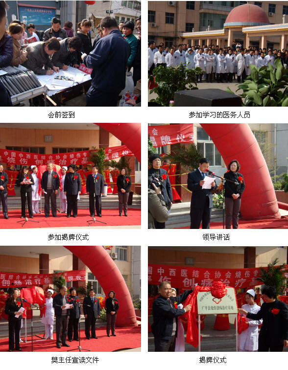 2010年4月8日,經(jīng)中國(guó)中西醫(yī)結(jié)合學(xué)會(huì)燒傷專業(yè)委員會(huì)審核批復(fù)的“中國(guó)中西醫(yī)結(jié)合學(xué)會(huì)燒傷專業(yè)委員會(huì)廣平縣燒傷創(chuàng)瘍治療基地”在河北省廣平縣人民醫(yī)院舉行了隆重的揭牌儀式。廣平縣縣委領(lǐng)導(dǎo)及衛(wèi)生局領(lǐng)導(dǎo)到會(huì)參加了揭牌儀式并發(fā)表了講話,對(duì)此次廣平縣醫(yī)院引進(jìn)皮膚再生醫(yī)療技術(shù)并建立廣平縣燒傷創(chuàng)瘍治療基地給予了充分的肯定,并表示縣委及衛(wèi)生局會(huì)大力支持此項(xiàng)造福民生的工作。儀式還邀請(qǐng)了中國(guó)中西醫(yī)結(jié)合學(xué)會(huì)燒傷專業(yè)委員會(huì)常委樊兆宗主任及河北片區(qū)主任王琳琳,樊主任宣讀了中國(guó)中西醫(yī)結(jié)合學(xué)會(huì)燒傷專業(yè)委員會(huì)關(guān)于建立廣平縣醫(yī)院燒傷創(chuàng)瘍治療基地的批復(fù)文件。此次活動(dòng)還邀請(qǐng)了周邊縣的縣鄉(xiāng)鎮(zhèn)醫(yī)院的領(lǐng)導(dǎo)及主任參加觀摩,并邀請(qǐng)樊兆宗主任在儀式結(jié)束后進(jìn)行了“皮膚再生醫(yī)療技術(shù)的應(yīng)用”的培訓(xùn)講座。此次活動(dòng)取得了圓滿的成功,廣平縣電視臺(tái)等多家媒體也給予了廣泛的報(bào)道。