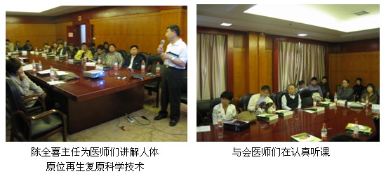 2011年5月21日上午,人體再生復(fù)原科學(xué)技術(shù)培訓(xùn)班在河南省鶴壁市??h大伾山賓館舉辦,來自??h人民醫(yī)院外科、骨科、胸外科、腫瘤科、急診科,??h婦產(chǎn)科醫(yī)院,??h第二人醫(yī)院外科、骨科共83人參加了此次培訓(xùn)。其中主任醫(yī)師8名,副主任醫(yī)師21名,主治醫(yī)師和住院醫(yī)師共54名。北京榮祥再生醫(yī)學(xué)研究所臨床部專家陳全喜主任親自為浚縣三個(gè)醫(yī)院的醫(yī)師進(jìn)行了人體再生復(fù)原科學(xué)技術(shù)的專題培訓(xùn)。