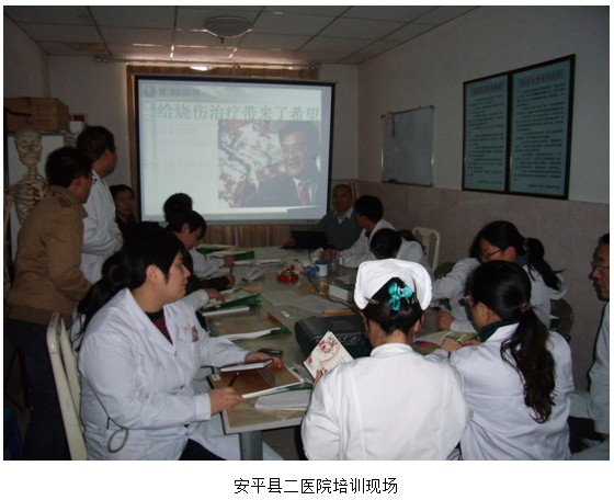 2012年11月13日及23日,應(yīng)安平縣二醫(yī)院和東光縣人民醫(yī)院的邀請,中國中西醫(yī)結(jié)合學會燒傷專業(yè)委員會常委樊兆宗教授在兩家醫(yī)院分別院進行了“再生復(fù)原醫(yī)療技術(shù)在創(chuàng)面修復(fù)中的應(yīng)用”學術(shù)培訓。樊教授在授課中展示了大量的臨床病例圖片,介紹了不同深度的燒傷創(chuàng)面及各類難愈性創(chuàng)傷、潰瘍創(chuàng)面的規(guī)范化處理方法與技巧、注意事項等;強調(diào)了再生復(fù)原療法在深I(lǐng)I度和III度燒傷創(chuàng)面清創(chuàng)時要盡早進行處理,加速創(chuàng)面的液化;演示了糖尿病足等難愈性創(chuàng)面中筋膜室減壓和壞死組織徹底的清創(chuàng)術(shù);介紹了多功能敷料創(chuàng)瘍貼的應(yīng)用范圍、適應(yīng)癥、規(guī)范清創(chuàng)換藥技術(shù)等。參加培訓的醫(yī)務(wù)人員均被這一技術(shù)神奇的療效所折服。