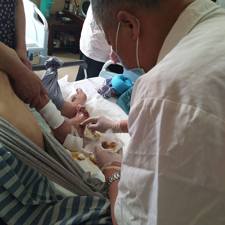 5月21日下午,北京榮祥再生醫(yī)學(xué)研究所副所長(zhǎng)、中國(guó)中西醫(yī)結(jié)合學(xué)會(huì)燒傷專業(yè)委員會(huì)常務(wù)委員、《燒傷創(chuàng)瘍雜志》副總編輯、應(yīng)用燒傷創(chuàng)瘍?cè)偕t(yī)療技術(shù)治療糖尿病足領(lǐng)域?qū)<?、研究員王洪生教授應(yīng)邀前往廣東省四會(huì)市萬(wàn)隆醫(yī)院會(huì)診6例病人,其中一例燒傷病人達(dá)40%、三度燒傷達(dá)10%的重度燒傷,王教授指導(dǎo)并帶領(lǐng)全科主任醫(yī)生護(hù)理共6人在病房換藥,并在此過程中糾正一些不規(guī)范的換藥事項(xiàng),效果明顯。