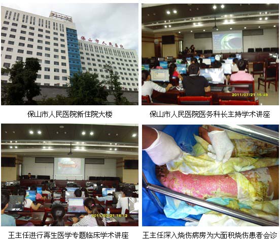 當(dāng)日下午2:30學(xué)術(shù)講座在保山市人民醫(yī)院電化教學(xué)廳舉行,該醫(yī)院醫(yī)務(wù)科長主持了學(xué)術(shù)講座,王主任應(yīng)邀以“再生復(fù)原療法在燒傷和難治性創(chuàng)傷潰瘍創(chuàng)面臨床規(guī)范化處理及新進(jìn)展”為題進(jìn)行了專題臨床學(xué)術(shù)講座。在學(xué)術(shù)講座中,王主任以大量的臨床實(shí)例及錄像治療直觀而深入淺出的介紹不同深度燒傷創(chuàng)面的規(guī)范化處理及各種難愈性創(chuàng)面的臨床治療要點(diǎn),大量典型臨床病例的展示,看得在場(chǎng)醫(yī)護(hù)人員目瞪口呆。然后王主任又以汶川地震中的傷員為例講了擠壓傷和鋼板外露等創(chuàng)面的處理方法,兩個(gè)多小時(shí)的精彩講述贏得了在場(chǎng)醫(yī)護(hù)人員的一次又一次熱烈的掌聲。會(huì)后應(yīng)保山市人民醫(yī)院醫(yī)務(wù)科及燒傷科楊主任的邀請(qǐng),王主任來到該醫(yī)院燒傷科為一例汽油火焰燒傷總面積達(dá)60%TBSA大面積患者會(huì)診,患者家屬感動(dòng)的說我女兒真有福。