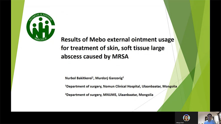 另一位講者,是來(lái)自蒙古Nomun臨床醫(yī)院的Nurbol Bakhytkyeryei醫(yī)生,他的演講題目為《濕潤(rùn)燒傷膏治療耐甲氧西林金黃色葡萄球菌感染膿腫》(Results of Moist Exposed Burn Ointment Usage for Treatment of Large Abscess Caused by MRSA)。在演講中,他分享了一例大面積感染壞死患者的治療,全程應(yīng)用濕潤(rùn)暴露療法,創(chuàng)面愈合后未產(chǎn)生瘢痕,且肢體功能恢復(fù)良好。
