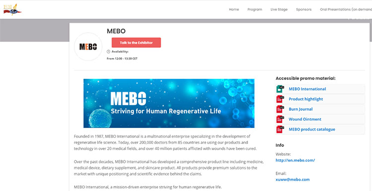 自2010年以來(lái),美寶國(guó)際已經(jīng)連續(xù)參加了6屆ISBI大會(huì),是ISBI最重要的合作伙伴之一。繼2016年和2018年連續(xù)2屆成為ISBI大會(huì)最高級(jí)別贊助商后,美寶國(guó)際今年再次成為ISBI大會(huì)的最大贊助商之一。此次大會(huì)上,美寶國(guó)際精心設(shè)計(jì)了電子展臺(tái),力求從多方面向參會(huì)者展示企業(yè)風(fēng)采。展臺(tái)上不僅展示了濕潤(rùn)燒傷膏、疤痕軟膏、創(chuàng)瘍貼等已在全球應(yīng)用數(shù)十年的核心產(chǎn)品,還同時(shí)與全球?qū)<曳窒砹藵駶?rùn)燒傷膏治療燒傷的最新臨床研究進(jìn)展。