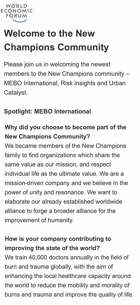 世界經(jīng)濟論壇“新領(lǐng)軍者組織”對美寶國際每年在燒傷創(chuàng)瘍領(lǐng)域培訓數(shù)千名國際醫(yī)生,提高當?shù)蒯t(yī)療衛(wèi)生能力,減少燒傷創(chuàng)瘍患者死亡率,改善他們的生活做出的努力與貢獻表達了充分肯定。