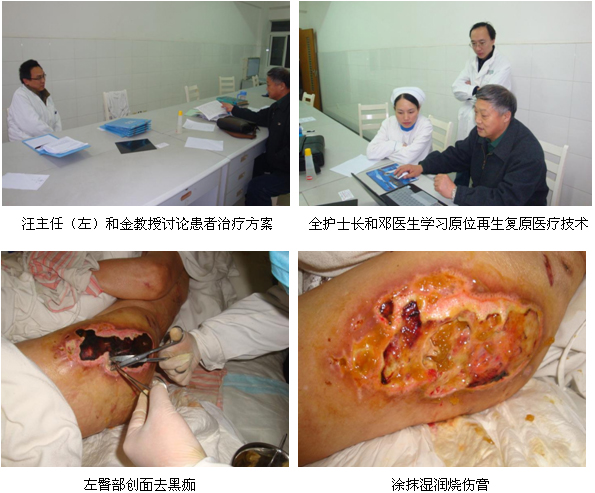 2010年12月17日至12月19日,中國中西醫(yī)結(jié)合學(xué)會(huì)燒傷專業(yè)委員會(huì)金黨軍教授在對(duì)宜昌市各醫(yī)院走訪期間,應(yīng)該院外科汪長(zhǎng)青主任和全麗麗護(hù)士長(zhǎng)的邀請(qǐng),對(duì)剛?cè)朐旱囊晃荒X梗塞偏癱老年患者多發(fā)性褥瘡創(chuàng)面進(jìn)行了臨床換藥指導(dǎo)。該患已79歲高齡,金教授見到患者時(shí),背部褥瘡結(jié)黑痂,左臀部形成空腔,這兩處面積較大,伴有惡臭;另右臀部、膝蓋、左小腿及左腳均有潰瘍創(chuàng)面,并伴低蛋白血糖和疝氣。在全護(hù)士長(zhǎng)等護(hù)士的陪同下,金教授為患者耐心地清洗周邊的創(chuàng)面,剪去黑痂,空腔上使用濕潤(rùn)燒傷膏油紗條填塞,并采用藥膏和創(chuàng)瘍貼結(jié)合換藥,金教授通過兩個(gè)多小時(shí)實(shí)際操作,詮釋了再生醫(yī)療技術(shù)對(duì)創(chuàng)面的處理要點(diǎn),隨后金教授結(jié)合多媒體材料為現(xiàn)場(chǎng)的醫(yī)護(hù)人員講解了再生醫(yī)療技術(shù)在燒傷、創(chuàng)瘍、褥瘡、潰瘍等創(chuàng)面的應(yīng)用,講課結(jié)束后,現(xiàn)場(chǎng)的醫(yī)護(hù)人員表示通過看到金教授親自為患者換藥及他精彩地講課,使大家實(shí)實(shí)在在地掌握了原位再生復(fù)原醫(yī)療技術(shù)的規(guī)范換藥及其在臨床各科室的廣泛應(yīng)用,今后會(huì)不斷提高原位再生復(fù)原醫(yī)療技術(shù)水平,救治更多患者。