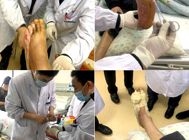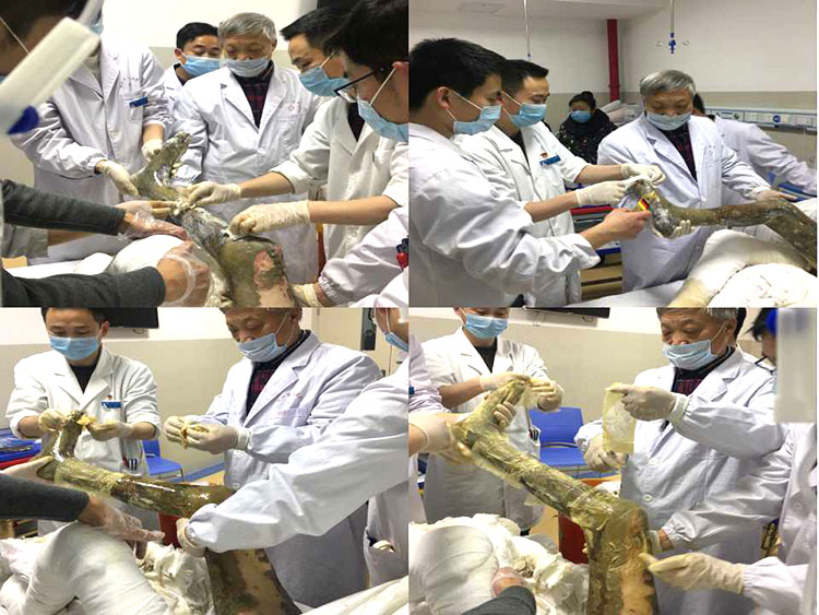 李主任陪同金教授與劉群峰醫(yī)生,張耀武醫(yī)生,鄭孟杰醫(yī)生,王帥醫(yī)生及于海洋醫(yī)生,共同會診了五位燒燙傷患者,一位雙足凍傷患者,一位疑似下肢栓塞并感染患者和一位丹毒患者。各位醫(yī)師在進行再生醫(yī)療技術規(guī)范換藥過程中,積極同金教授探討技術要點,如:怎樣探查壞死組織的深淺;創(chuàng)面壞死組織削除深淺及技巧等。當大家會診到一位70%大面積燒傷高齡患者時,在金教授和李主任的帶領下,科室全體總動員,大家密切配合,規(guī)范操作,歷時近兩個小時完成創(chuàng)面治療!