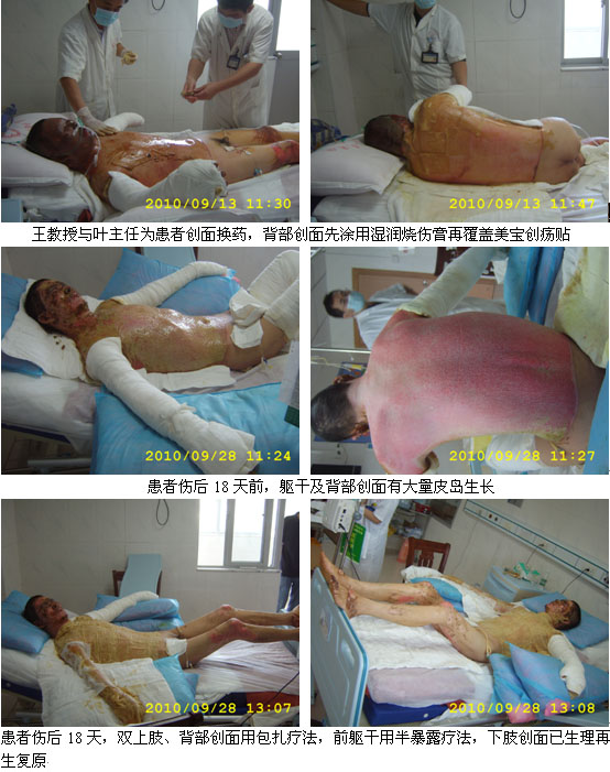 2010年10月9日,對(duì)惠陽(yáng)區(qū)第一人民醫(yī)院燒傷整形手足顯微外科和他們收治的這例大面積深度燒傷患者來(lái)說(shuō),都是值得慶祝的日子,經(jīng)過(guò)該科醫(yī)護(hù)人員30多個(gè)夜以繼日的精心治療,該患者深度燒傷創(chuàng)面未進(jìn)行切、削痂植皮,全程應(yīng)用燒傷皮膚原位再生復(fù)原技術(shù)治療創(chuàng)面,實(shí)現(xiàn)了皮膚組織器官的原位再生復(fù)原,避免了殘疾。當(dāng)日上午9時(shí),王洪生教授再次來(lái)到惠陽(yáng)區(qū)第一人民醫(yī)院,在該院陳浩院長(zhǎng)以及燒傷手足顯微外科葉琪毅主任陪同,深入燒傷病房為患者查房,指導(dǎo)醫(yī)生對(duì)患者創(chuàng)面康復(fù)期的治療,并為剛剛收治的1例燒傷總面積達(dá)45%TBSA的深度燒傷患者進(jìn)行了會(huì)診和指導(dǎo)。