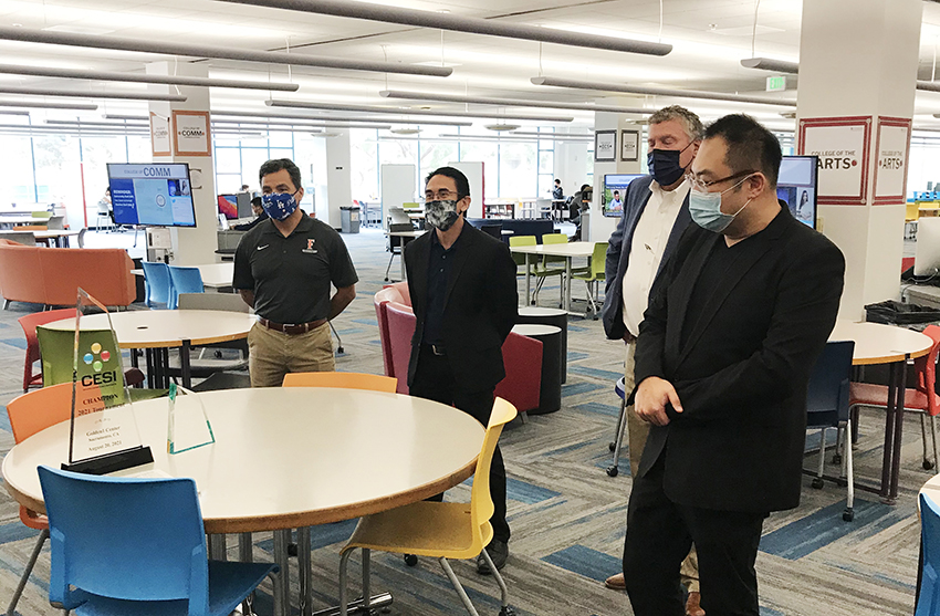 當(dāng)?shù)貢r(shí)間10月8日,美寶集團(tuán)董事局主席徐鵬攜洛杉磯周刊(LA Weekly)CEO Calle應(yīng)邀參觀考察了加州州立大學(xué)富勒頓分校電競項(xiàng)目及電競團(tuán)隊(duì)。加州州立大學(xué)富勒頓分校校長Fram Virje(在線)、副校長 Greg Saks在校園現(xiàn)場熱情接待了徐鵬一行。校長Fram Virje特別介紹了該校,表示富勒頓分校是整個(gè)加州學(xué)生數(shù)量最多的公立大學(xué),并對徐鵬對學(xué)校的支持及學(xué)生的指導(dǎo)表示了感謝。Saks副校長特意帶領(lǐng)徐鵬一行參觀了富勒頓分校圖書館電競中心,該校電競隊(duì)伍今年斬獲了薩科拉門托國王隊(duì)主場體育館舉行的電競比賽冠軍。