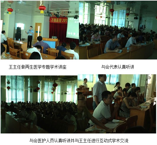 會議于當(dāng)日下午2時40分準(zhǔn)時在該院會議室舉行,來自四會市人民醫(yī)院、中醫(yī)院、婦幼醫(yī)院、紅會醫(yī)院、萬隆醫(yī)院及大沙、黃田、羅源等鎮(zhèn)衛(wèi)生院共16個醫(yī)療單位共200余人參會到會聆聽王主任的專題講座,萬隆醫(yī)院業(yè)務(wù)副院長汪國斌主持了會議,市衛(wèi)生局徐美華科長到會發(fā)表賀詞。在學(xué)術(shù)講座中,王主任首先向與會代表就近年來在再生醫(yī)學(xué)領(lǐng)域所取得的重大實驗及臨床研究成果,并結(jié)合了大量的臨床病例圖片及錄像資料,主要針對各類難愈性創(chuàng)傷、潰瘍創(chuàng)面的規(guī)范化處理方法與技巧、注意事項等進(jìn)行了細(xì)致地講解,活動持續(xù)到下午17時40分結(jié)束。