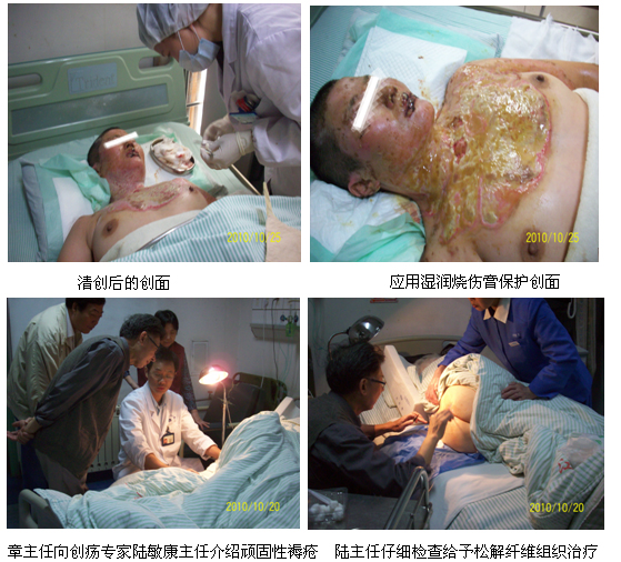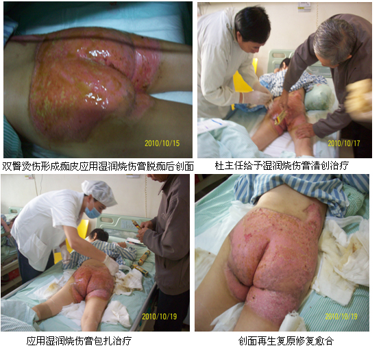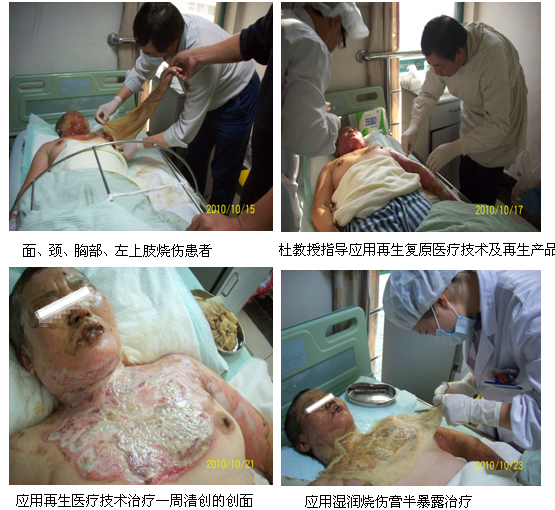 2010年10月9日,在南京舉辦了各大醫(yī)院燒傷整形科高級醫(yī)療人員座談會后,江蘇省人民醫(yī)院燒傷整形科率先在臨床推廣應(yīng)用再生醫(yī)療技術(shù)及再生系列產(chǎn)品治療燒傷患者3名,應(yīng)用創(chuàng)瘍貼治療褥瘡患者1名。在應(yīng)用再生醫(yī)療技術(shù)治療兩周后,其中1名燒傷患者以痊愈出院,另1名患者大部分燒傷創(chuàng)面已愈合,部分深I(lǐng)I度~淺III度創(chuàng)面組織生機良好?;颊邞?yīng)用再生醫(yī)療技術(shù)換藥治療時,創(chuàng)面“不疼痛、不出血、創(chuàng)面不存留液化物和壞死組織”(即創(chuàng)面治療三不原則),深受醫(yī)生護士和患者及家屬的歡迎,達(dá)到了推廣再生復(fù)原醫(yī)療技術(shù)地目的。