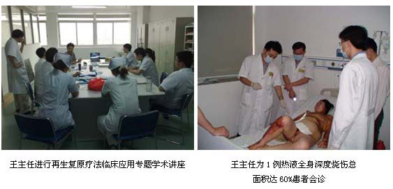 為讓該醫(yī)院燒傷外科的醫(yī)護(hù)人員盡快掌握、應(yīng)用原位再生復(fù)原醫(yī)療技術(shù)救治大面積深度燒傷,2011年5月4日,中國中西醫(yī)結(jié)合學(xué)會燒傷專業(yè)委員會常委、中國燒傷創(chuàng)瘍雜志社副總編輯、北京燒傷創(chuàng)瘍研究所副所長、臨床部主任王洪生研究員應(yīng)邀到該醫(yī)院為一例成人大面積深度燒傷患者會診,指導(dǎo)對該患者的救治,為確保該患者的成功救治及讓該醫(yī)院燒傷外科的醫(yī)護(hù)人員全面掌握對大面積深度燒傷規(guī)范的臨床處理和全身綜合治療技術(shù),2011年5月12日,王洪生主任再次蒞臨該醫(yī)院,跟蹤指導(dǎo)對該例大面積深度燒傷的救治工作,當(dāng)日上午,在為該患者會診后,北海市中醫(yī)醫(yī)院普外科(燒傷外科,神經(jīng)、泌尿外科)主任史國恩和副主任蔡漢章及其科室醫(yī)生護(hù)士強(qiáng)烈要求王主任給他們做一個詳細(xì)的再生復(fù)原療法療法臨床應(yīng)用學(xué)術(shù)講座,王主任欣然接受了他們的請求,在該科室醫(yī)生辦公室以“再生復(fù)原療法技術(shù)在大面積深度燒傷及難愈性創(chuàng)瘍創(chuàng)面臨床規(guī)范化處理”為題為該科室的醫(yī)護(hù)人員進(jìn)行了專題講座。在學(xué)術(shù)講座中,王主任對燒傷的深度劃分結(jié)合臨床圖片做了生動的講解,對燒傷創(chuàng)面前期和后期的處理方法、抗感染、營養(yǎng)支持療法、臟器功能保護(hù)、并發(fā)癥防治,并結(jié)合大量的臨床圖片對各種難愈性創(chuàng)傷,潰瘍創(chuàng)面的規(guī)范處理方法與技巧做了詳細(xì)地講解。