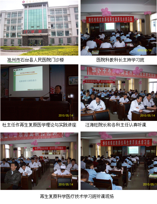 2010年5月14日,應(yīng)石臺縣人民醫(yī)院汪海旺院長和外科韓軍主任之邀,中國中西醫(yī)結(jié)合學(xué)會燒傷專業(yè)委員會常委、北京美寶燒傷創(chuàng)瘍研究所臨床部杜福勤主任與中國中西醫(yī)結(jié)合學(xué)會駐安徽片區(qū)張朝軍主任、陳義勝同志一同來到石臺縣人民醫(yī)院,在該院的會議室舉辦了燒傷創(chuàng)瘍原位再生復(fù)原醫(yī)療技術(shù)學(xué)習(xí)班講座。會議由科教科長主持,參加會議的有汪院長、韓軍主任及外科、內(nèi)科、骨科、婦產(chǎn)科、皮膚科、耳鼻喉科、肛腸科的醫(yī)護人員,共計100余人。
