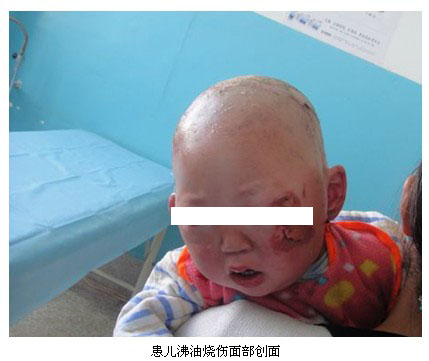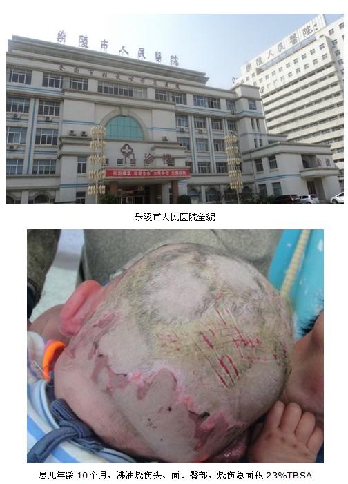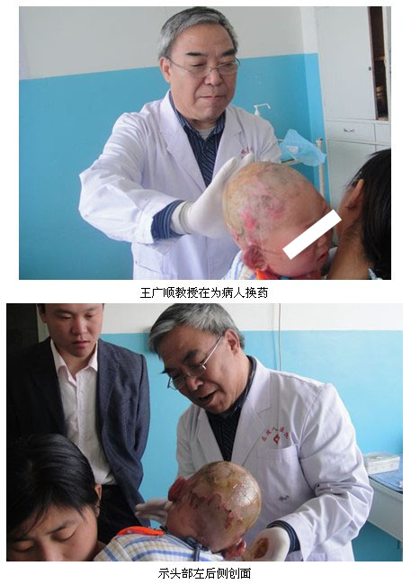 樂陵市人民醫(yī)院燒傷科于2011年4月25日接收了1名頭皮沸油燒傷小兒患者,該院高院長、燒傷科吳主任非常重視,與燒傷科魯國軍醫(yī)生一同為患兒采用再生醫(yī)療技術(shù)治療,治療1天后,該患兒兩眼瞼腫脹,頭皮創(chuàng)面蒼白,痂皮硬,小兒哭鬧。北京市燒傷創(chuàng)瘍研究所醫(yī)療部專家王廣順教授當時正在濟南106醫(yī)院為蒙古國右足凍傷小伙治療,在接到該院領(lǐng)導(dǎo)的邀請后立即與徐亞磊同志一起乘車趕到該院進行技術(shù)指導(dǎo)。下午6點,王廣順教授在該院燒傷科吳主任、魯大夫及護士長的陪同下來到病房,見患兒年齡僅10個月,沸油燒傷頭面、臀部,燒傷總面積23%TBSA。王廣順教授親自應(yīng)用再生復(fù)原醫(yī)療技術(shù)為患者換藥,頭皮Ⅲ度創(chuàng)面采用“耕耘療法”,通過涂藥等局部治療后,又進一步調(diào)整了全身治療方案。次日換藥治療時察看該患兒頭皮Ⅲ度創(chuàng)面,已見耕耘處紅暈、新鮮有彈性。