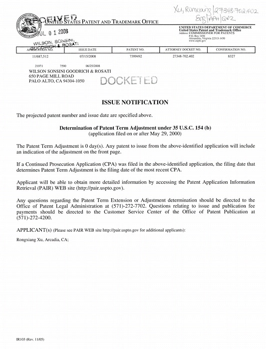 申請人可登陸專利申請信息修改網(wǎng)站 (http://pair.uspto.gov)獲取更多信息。