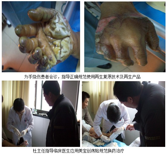 交流中杜主任感謝以上醫(yī)院的院長、科室主任多年來推廣和支持再生復(fù)原技術(shù)所做的努力和支持,希望今后進(jìn)一步加強(qiáng)協(xié)作。走訪期間杜主任為臨床醫(yī)生示范換藥,指導(dǎo)臨床醫(yī)生正確規(guī)范的應(yīng)用再生復(fù)原技術(shù)和再生產(chǎn)品,為廣大燒傷、創(chuàng)傷、潰瘍患者解除痛苦作出努力,造福廣大燒傷、創(chuàng)傷、潰瘍患者。