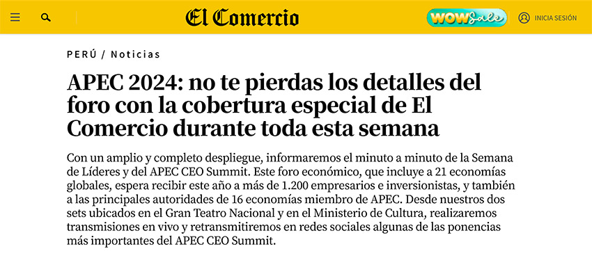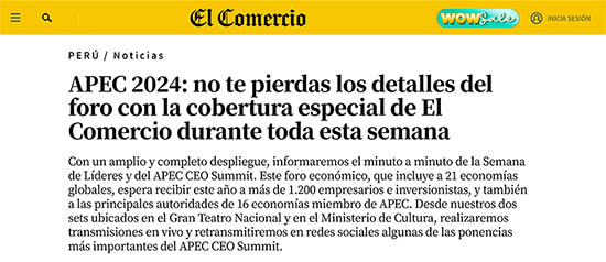 備受矚目的2024年亞太經(jīng)合組織(APEC)CEO峰會即將于11月13日至15日盛大啟幕。針對此次峰會為期數(shù)天的豐富議程,當?shù)貦嗤襟w《秘魯商報》(El Comercio)已率先進行了報道。以下是相關譯文及詳細鏈接: