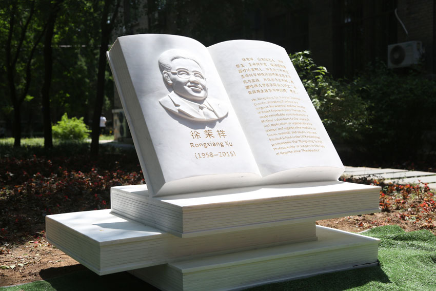 “榮祥樓”牌匾由中國傳統(tǒng)工藝景泰藍精制而成,徐榮祥教授紀(jì)念刻石則由通體漢白玉雕刻而成,碑書內(nèi)容中英文金字鑲刻,高度概括了徐榮祥教授的一生:徐榮祥,山東沾化人,外科醫(yī)生、生命科學(xué)家,燒傷濕潤暴露療法發(fā)明人。畢生致力于再生生命科學(xué)和燒傷創(chuàng)瘍再生醫(yī)學(xué)研究與實踐,并做出杰出貢獻。美國哈佛大學(xué)醫(yī)學(xué)院永久設(shè)立“徐榮祥再生醫(yī)學(xué)外科教授”席位。